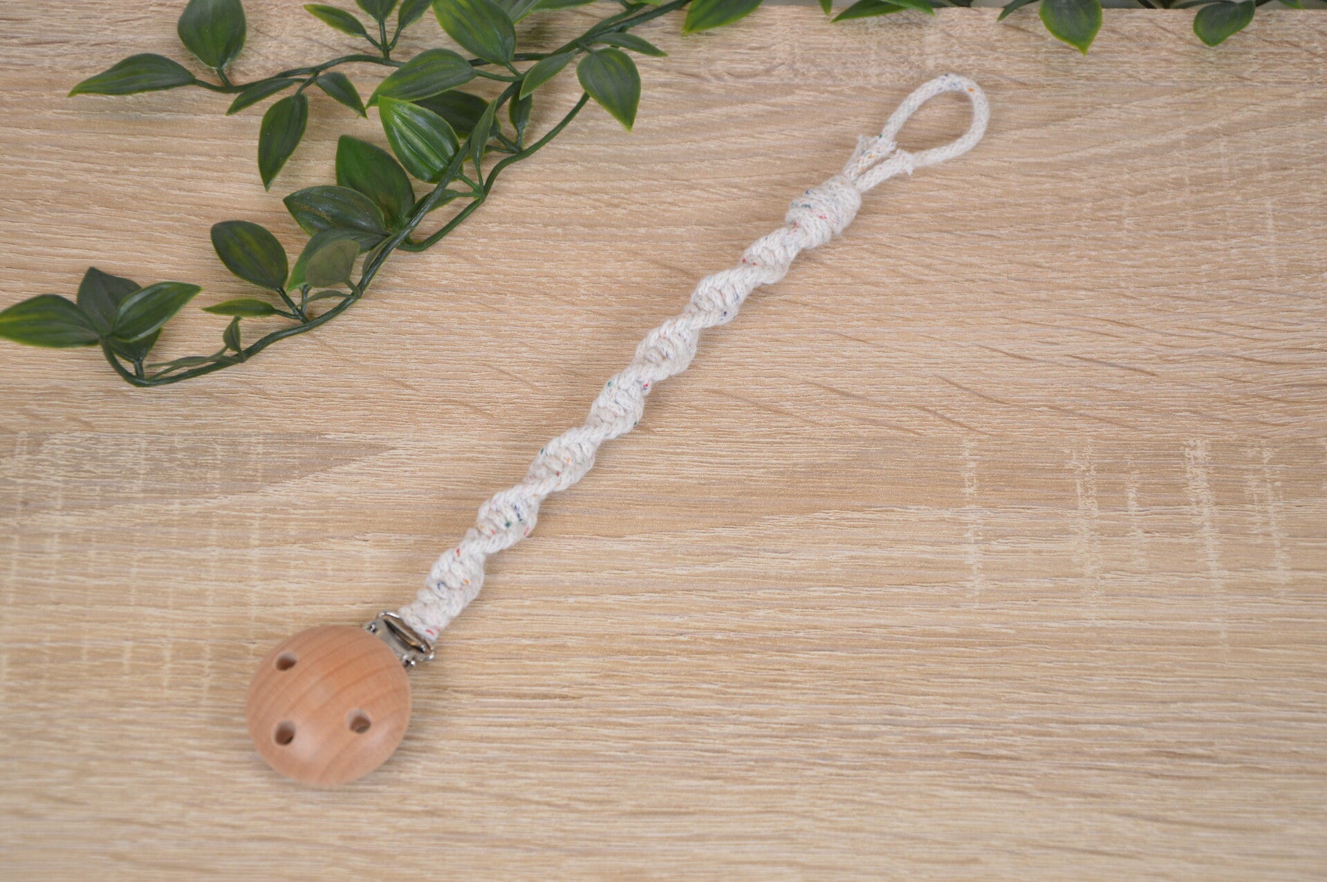 Deze tutjesketting is handgemaakt uit macramé. Ideaal om het tutje vast te maken aan de kleding van je kindje.